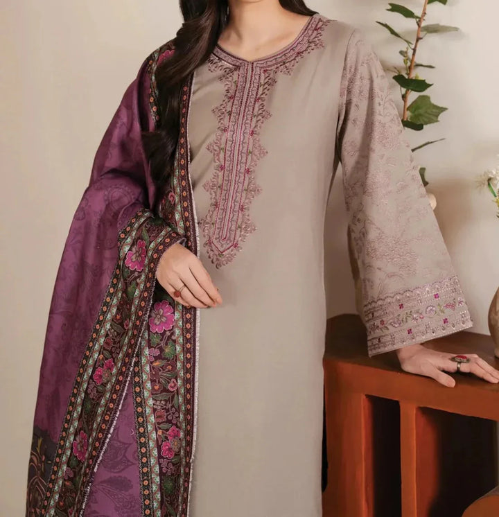 Grace Z-(W755 ) - Stitched Embroidered 3pc Marina Dress With Printed Shawl.
